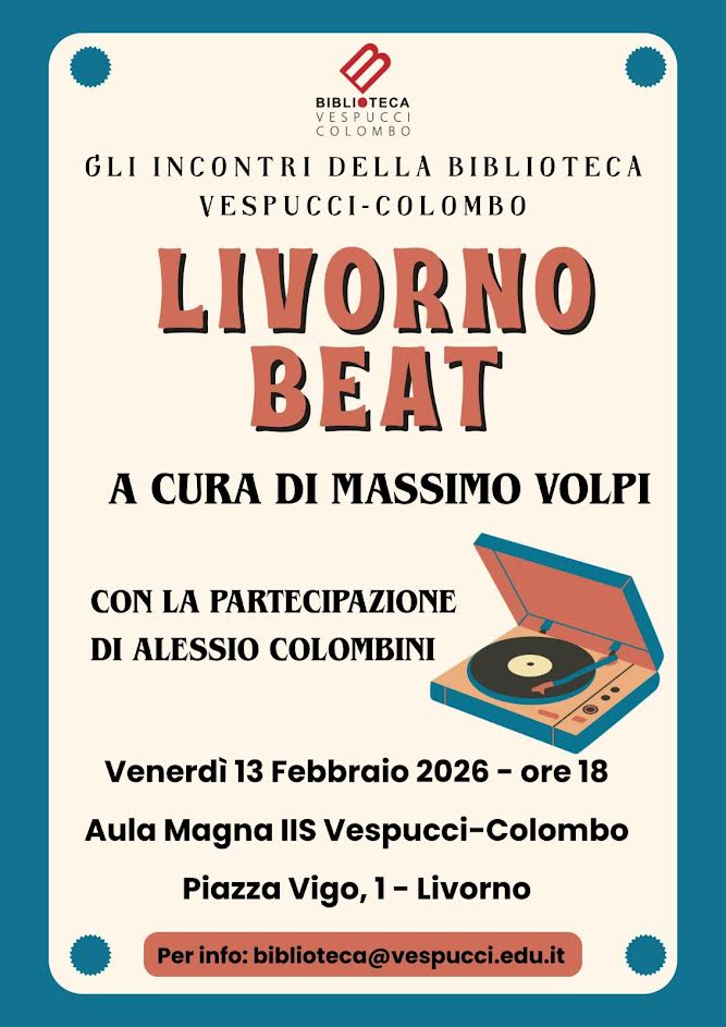 Per gli incontri culturali a cura della Biblioteca dell’Istituto “Vespucci-Colombo”, venerdì 13 febbraio, alle ore 18.00, nell’aula magna della sede di Piazza Vigo, Massimo Volpi parlerà della Livorno Beat, con la partecipazione dei musicisti Alessio Colombini e Cristiano Cei.