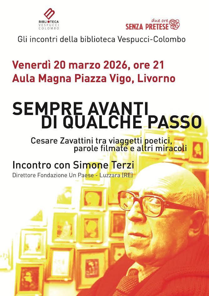 Proseguono gli incontri organizzati dalla Biblioteca dell’Istituto Vespucci – Colombo di Livorno. Venerdì 20 marzo 2026 alle ore 21,00, nell’aula magna della sede di Piazza Vigo, si svolgerà un incontro dal titolo: SEMPRE AVANTI DI QUALCHE PASSO – Cesare Zavattini tra viaggetti poetici, parole filmate e altri miracoli a cura di Simone Terzi, Direttore della Fondazione Un Paese e coordinatore delle attività del Centro Culturale Zavattini.